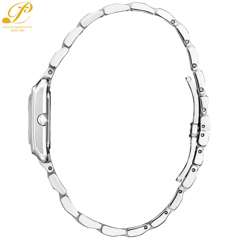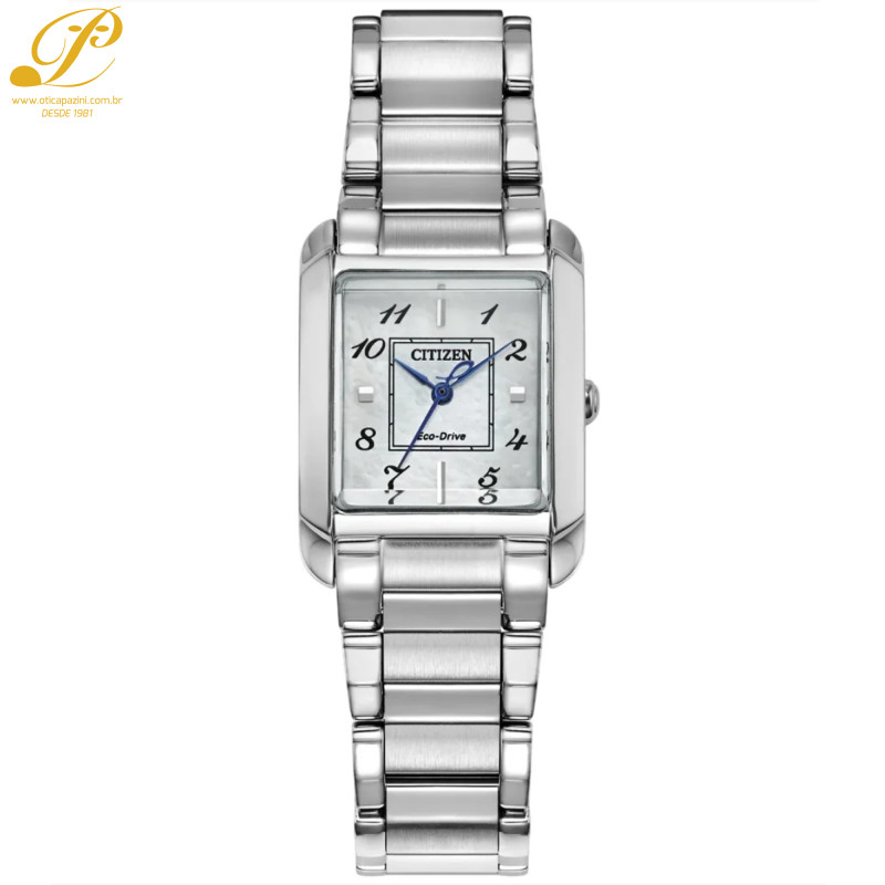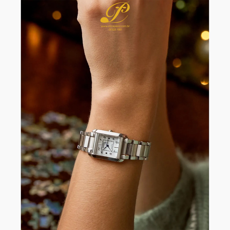 Linhas clássicas e sofisticação discreta fazem do Citizen L Bianca, a mais recente adição à nossa coleção feminina, uma peça encantadora de luxo sustentável. Com um design inspirado e que celebra os motivos femininos da Art Déco, este relógio distinto em aço inoxidável é um acessório cativante no pulso, perfeito para o uso diário. Uma forma retangular curva define a silhueta de 22 mm do relógio, com uma coroa e pulseira discretas. O aço inoxidável completa o visual. No mostrador em madrepérola, marcadores aplicados e impressos alternados, juntamente com ponteiros azulados, criam um estilo altamente estético, com o quadrado interno impresso sugerindo inspirações chiques. Alimentado de forma sustentável por qualquer fonte de luz, graças à tecnologia patenteada Eco-Drive, que dispensa o uso de bateria, este elegante relógio feminino é o complemento perfeito para qualquer look.
