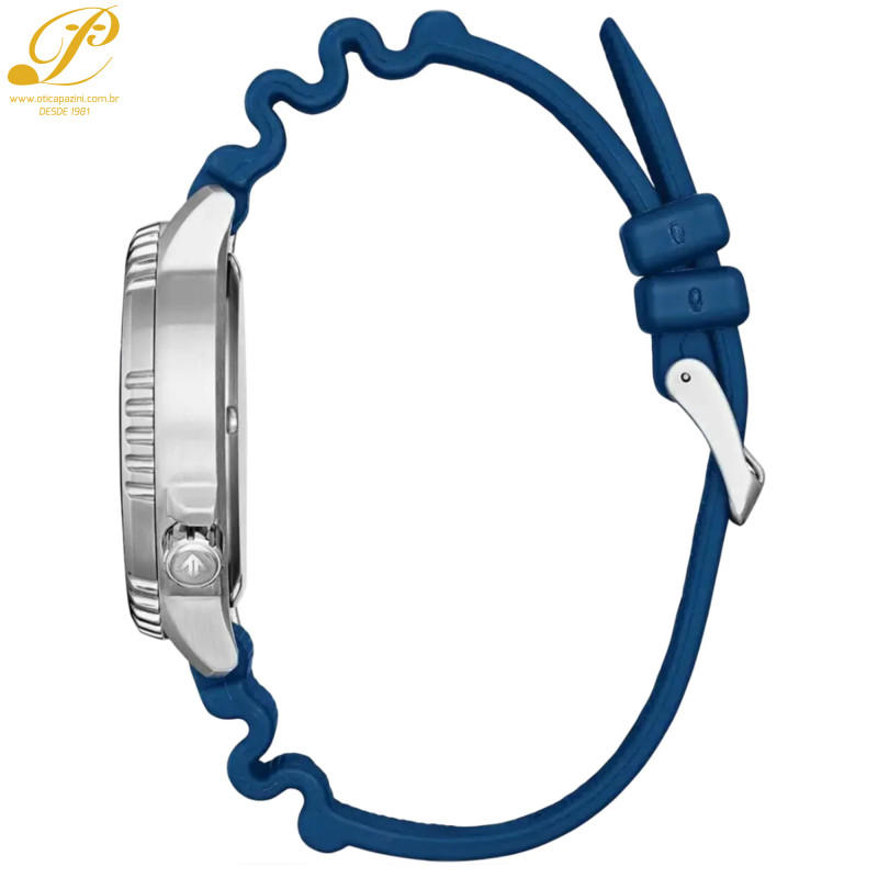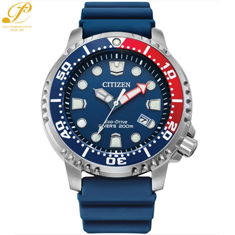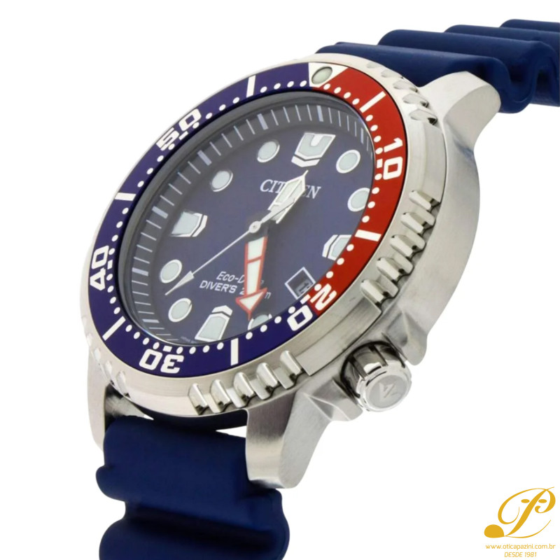 Para quem busca o relógio à prova d'água perfeito, o CITIZEN® Promaster Dive é a escolha ideal. Com certificação ISO para profundidades de até 200 metros, este relógio de mergulho masculino possui caixa em aço inoxidável e pulseira em poliuretano azul. O mostrador azul com indicador de data contrasta com os detalhes em azul e vermelho e o bisel giratório unidirecional em alumínio. Ele também possui ponteiros e marcadores luminescentes. Você nunca precisará se preocupar com a bateria, pois o relógio funciona de forma sustentável em qualquer condição de luminosidade graças à tecnologia Eco-Drive. Seja para explorar oceanos, nadar em rios ou simplesmente curtir uma tarde na piscina, este relógio terá uma ótima aparência e nunca deixará você na mão.