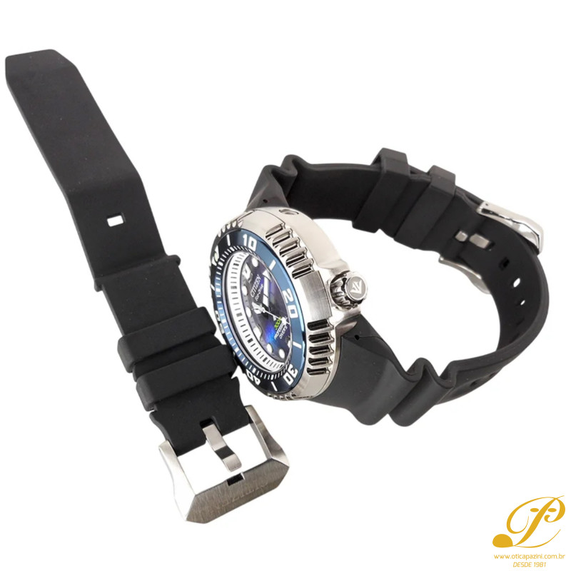 Inspirada nos belos oceanos que conectam o mundo, a série de relógios UNITE with BLUE reúne as cores dos sete mares em seus mostradores de policarbonato 100% reciclado. A Citizen reforça seu compromisso com a sustentabilidade ao incluir os modelos Promaster Dive, CITIZEN xC, Attesa e Sport Luxury nesta série. Este novo modelo de edição limitada faz parte da coleção Promaster Dive e oferece uma interpretação única de estilo e desempenho de nível profissional. Sua robusta caixa de aço inoxidável prateado de 46 mm garante resistência à água até 300 metros. Possui coroa rosqueada às 4 horas e um bisel preto de fácil manuseio para um visual arrojado. As asas ocultas conectam-se a uma pulseira feita com BENEBiOL™ PU, um material que inclui componentes de origem vegetal, garantindo um ajuste confortável no pulso. O mostrador de alta legibilidade ganha vida com uma tinta sem pigmentos que reflete a luz — a mesma luz que alimenta a tecnologia Eco-Drive — criando uma gama de tons aquáticos através das microestruturas da tinta. As funções incluem hora e data, e seu mecanismo movido a energia solar proporciona 365 dias de funcionamento sem bateria. Calibre E365. Edição limitada a 4.500 peças não numeradas em todo o mundo.