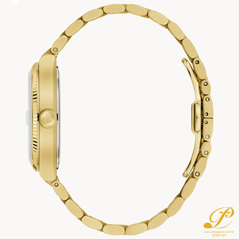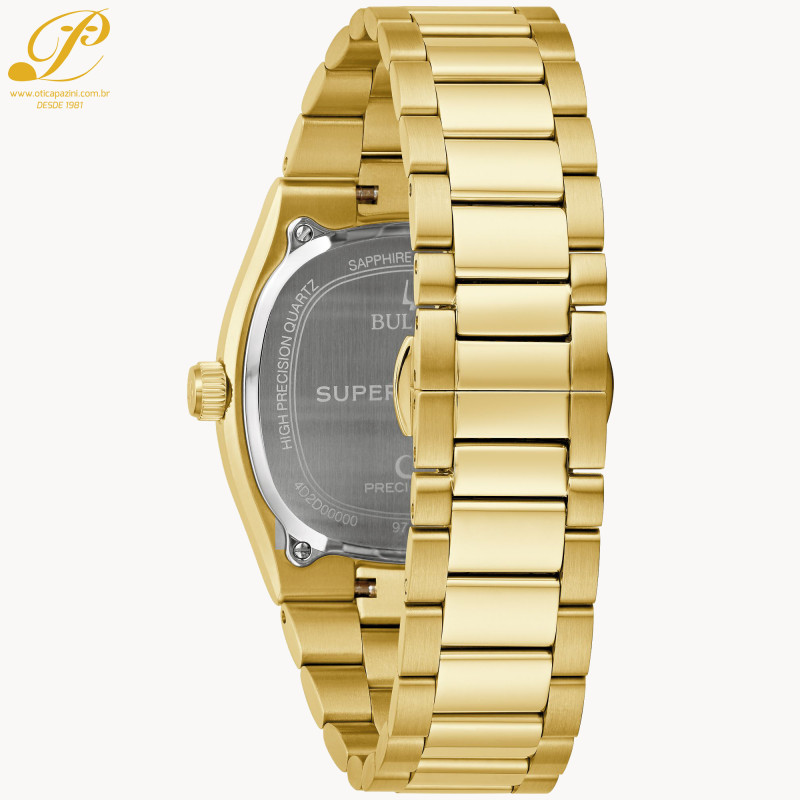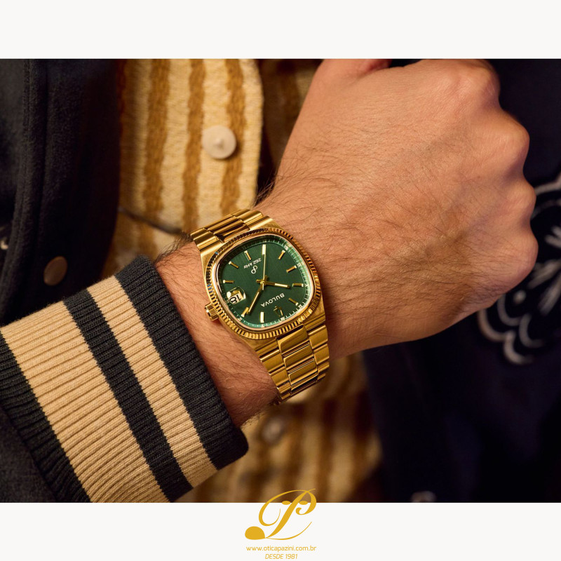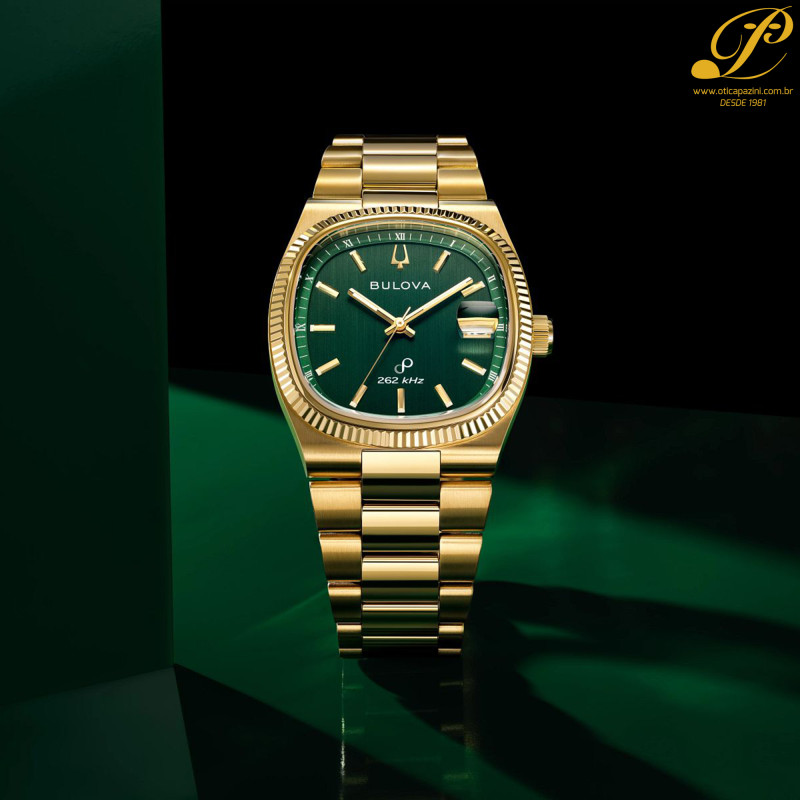 Inspirado no incrível Bulova Super Seville Day-Date da década de 1970, o Bulova Super Seville masculino combina a estética retrô com a mais moderna tecnologia de movimento, resultando em um apelo contemporâneo. Versátil para todos os estilos, a caixa de 38 mm em aço inoxidável dourado exibe uma presença marcante com uma silhueta impecável, criada pelo formato da caixa que se integra à pulseira de aço inoxidável de três elos, com fecho de báscula. Uma elegante luneta serrilhada com borda canelada realça a caixa e envolve o cristal de safira plano com lupa para a data. O mostrador, de um verde vibrante com acabamento escovado vertical, apresenta ponteiros e índices polidos em tom dourado e a data posicionada perfeitamente às 3 horas. O novo Bulova Super Seville é movido pelo nosso movimento de quartzo Precisionist de alta precisão, um revolucionário mecanismo de quartzo com 8 rubis que vibra a uma frequência notável de 262 kHz, preciso em segundos por ano, com maior resistência a variações de temperatura e um ponteiro de segundos com movimento contínuo e suave. Abrace uma elegância descomplicada com o Bulova Super Seville masculino.