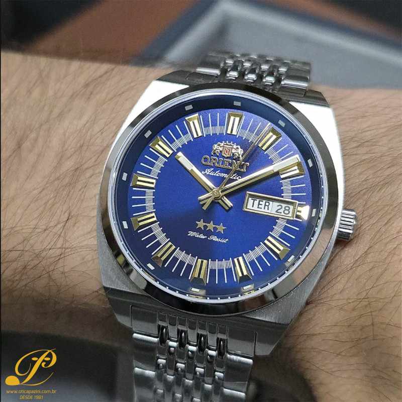 O Orient Heritage 3 Estrelas YN6SS018 D1SX é uma homenagem viva à tradição da relojoaria japonesa. Inspirado nos lendários modelos das décadas passadas, ele combina o mostrador azul metálico radiante com ponteiros, índices e o emblema dourado das três estrelas, símbolo máximo da linha 3 Estrelas — reconhecida mundialmente por sua durabilidade, elegância e precisão mecânica.